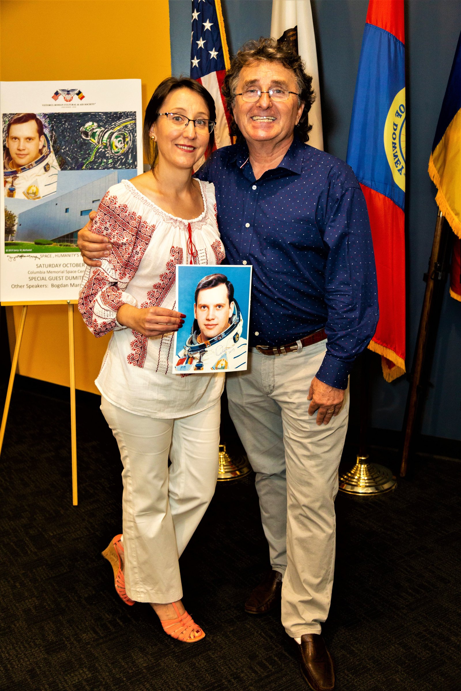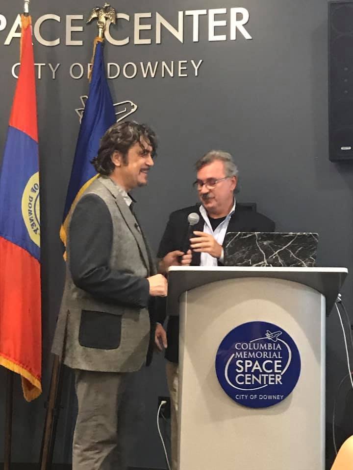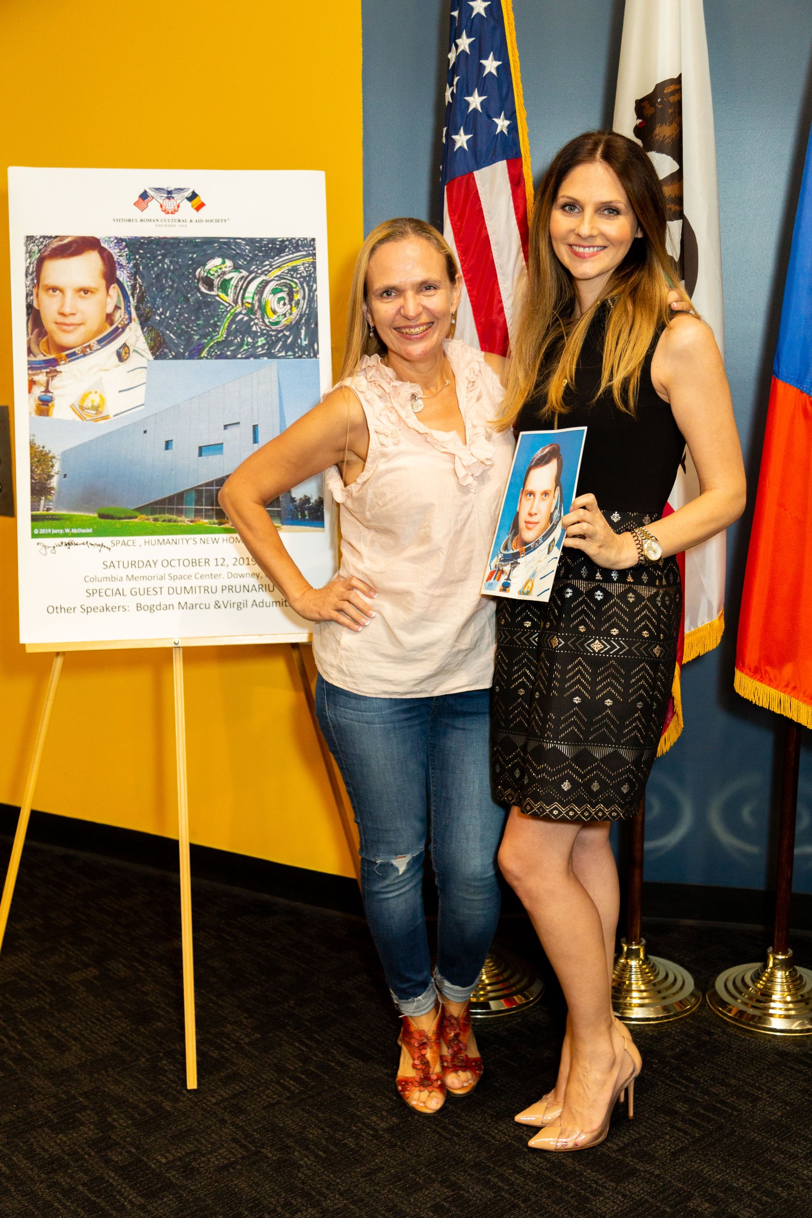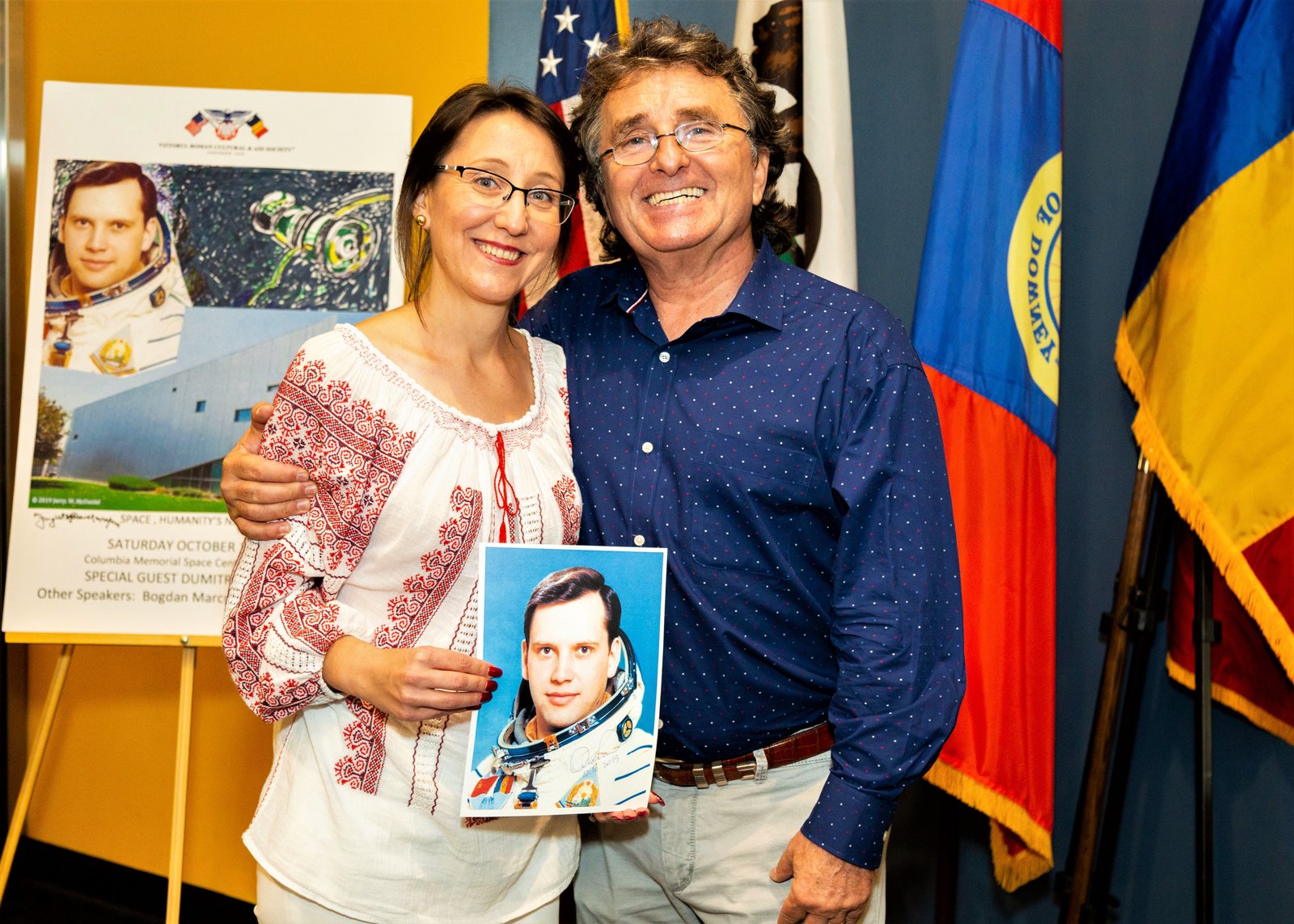 Among the beautiful artefacts and pictures related to space exploration belonging to the Columbia Center, the VRS society displayed three special graphical works by Jerry W.McDaniel, an artist with a wonderful reputation: one of the posters presented (“The Dawn of the Day” whose original painting is in the permanent US Air Force Art Collection) had been on the background TV screens broadcasting the Moon Landing of the Apollo 11 mission in 1969. Jerry W. McDaniel also designed the special poster for our special evening event. McDaniel attended the event together with Dr. Ileana Costea, California State University, Northridge professor, Director of I.C. ART Gallery that promotes the artist’s work. Two large prints of the event poster were issued and signed by both Dr. Prunariu and McDaniel; one was offered by the artist as a gift to the cosmonaut, while the other was given by VRS to the Columbia Memorial Center.