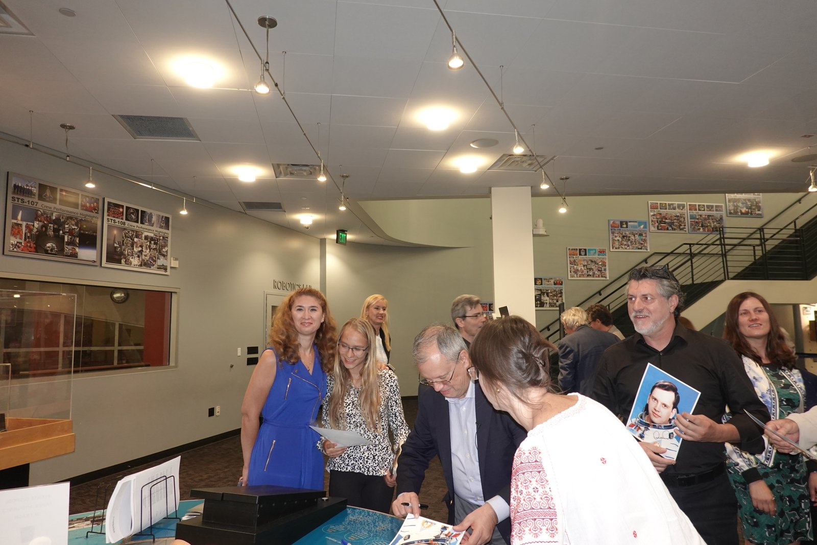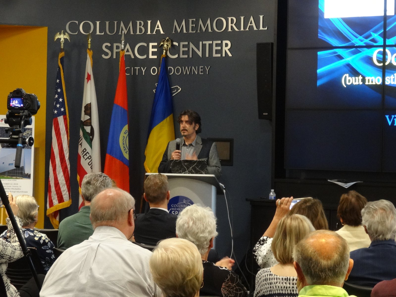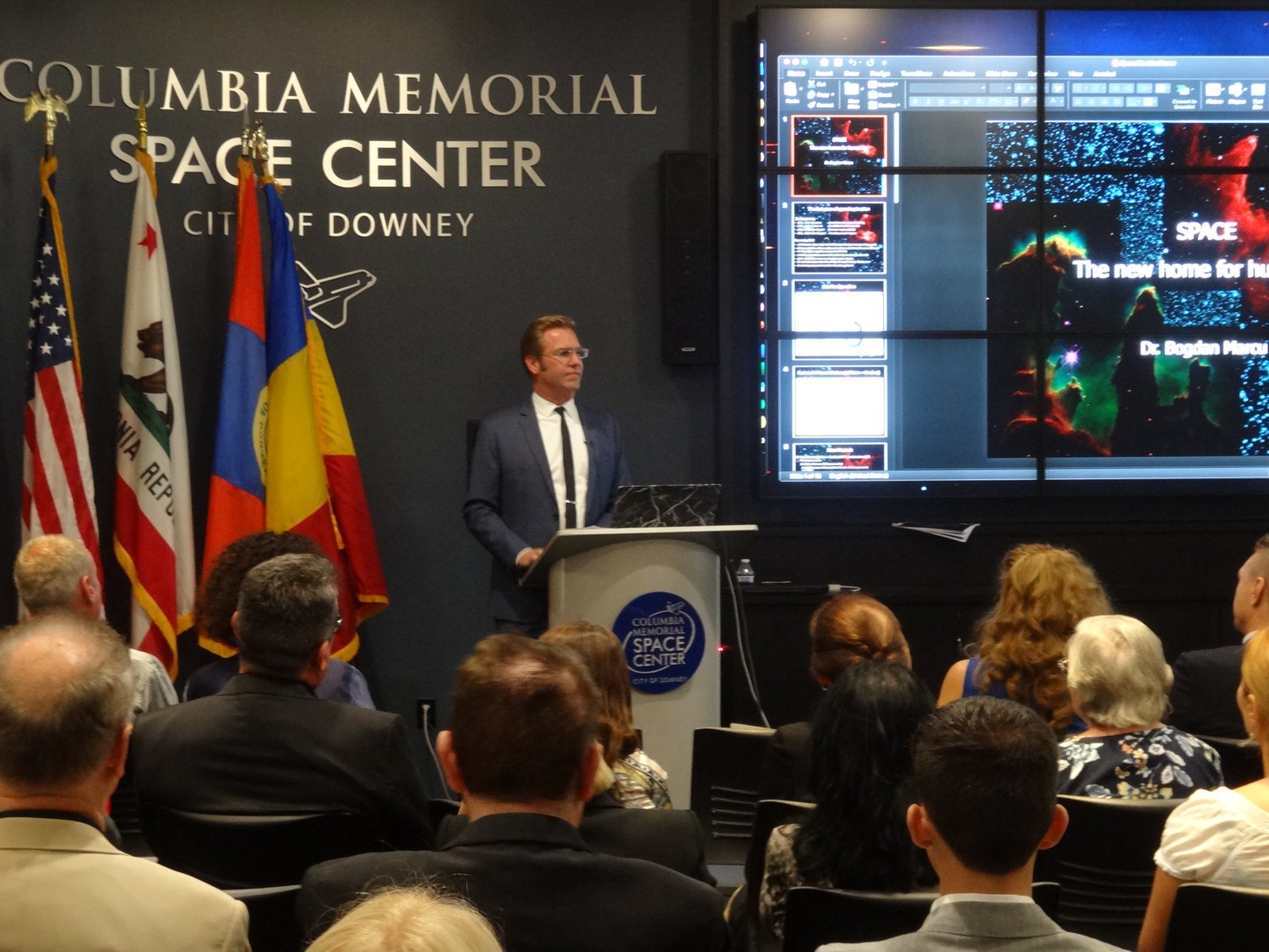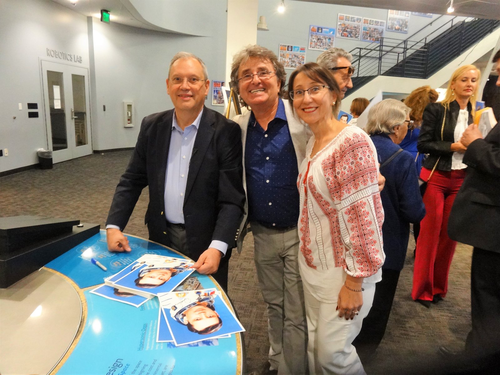 Among the beautiful artefacts and pictures related to space exploration belonging to the Columbia Center, the VRS society displayed three special graphical works by Jerry W.McDaniel, an artist with a wonderful reputation: one of the posters presented (“The Dawn of the Day” whose original painting is in the permanent US Air Force Art Collection) had been on the background TV screens broadcasting the Moon Landing of the Apollo 11 mission in 1969. Jerry W. McDaniel also designed the special poster for our special evening event. McDaniel attended the event together with Dr. Ileana Costea, California State University, Northridge professor, Director of I.C. ART Gallery that promotes the artist’s work. Two large prints of the event poster were issued and signed by both Dr. Prunariu and McDaniel; one was offered by the artist as a gift to the cosmonaut, while the other was given by VRS to the Columbia Memorial Center.