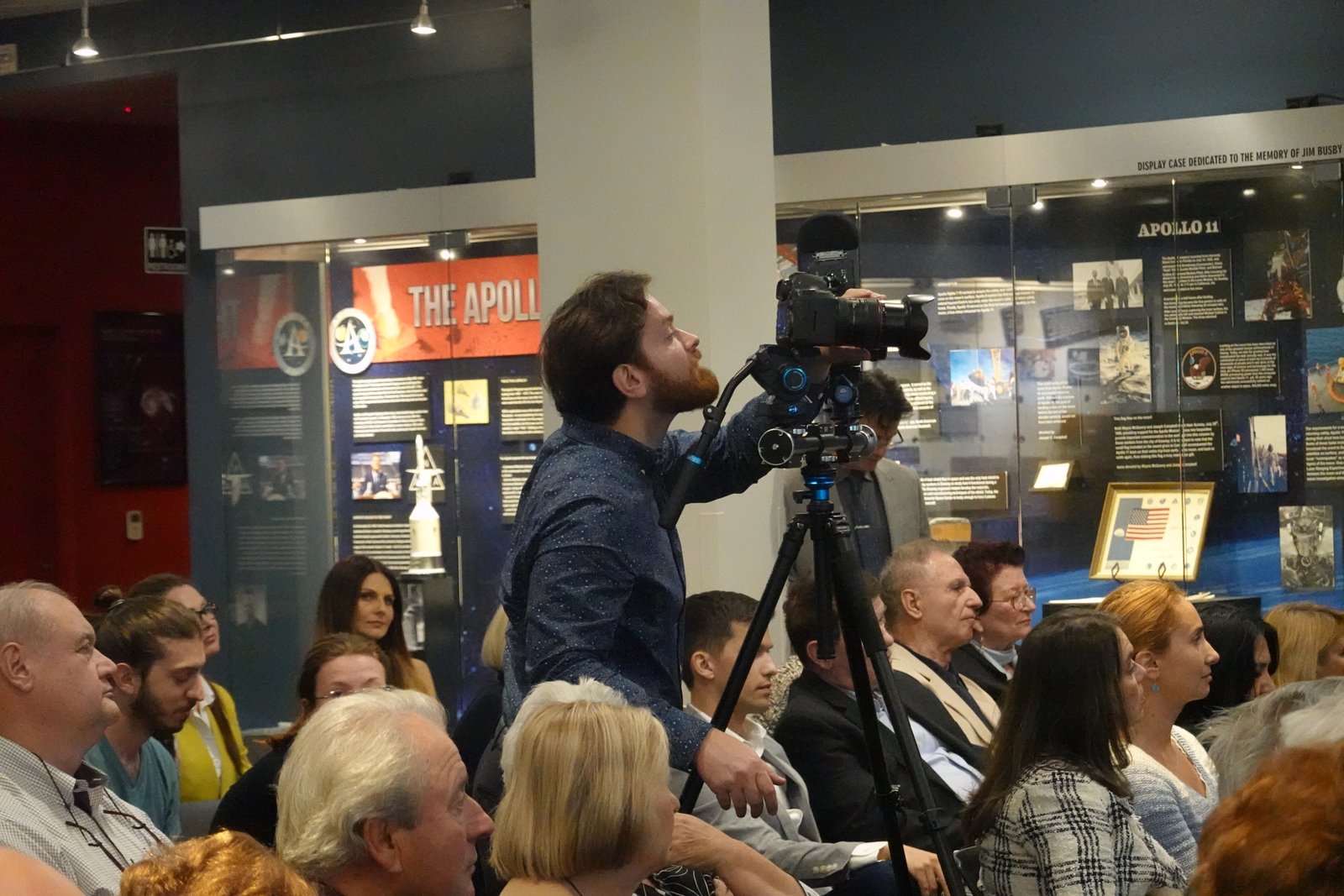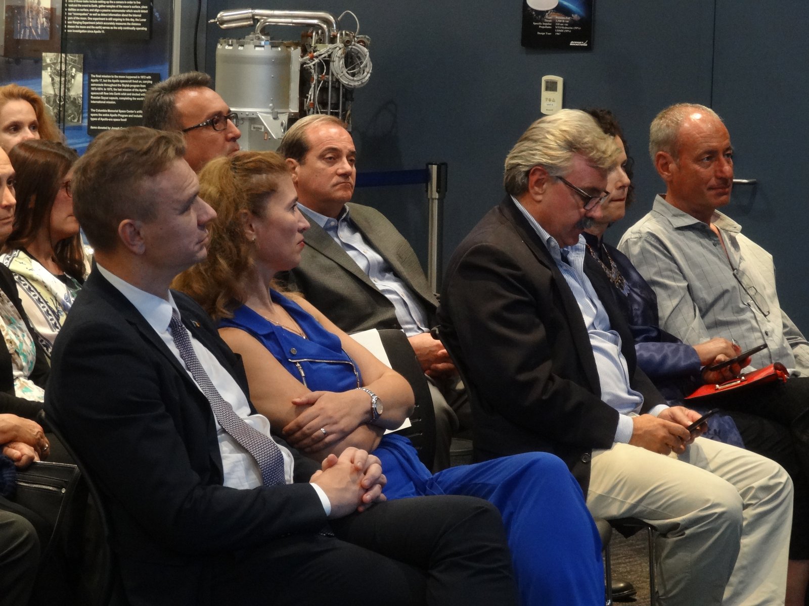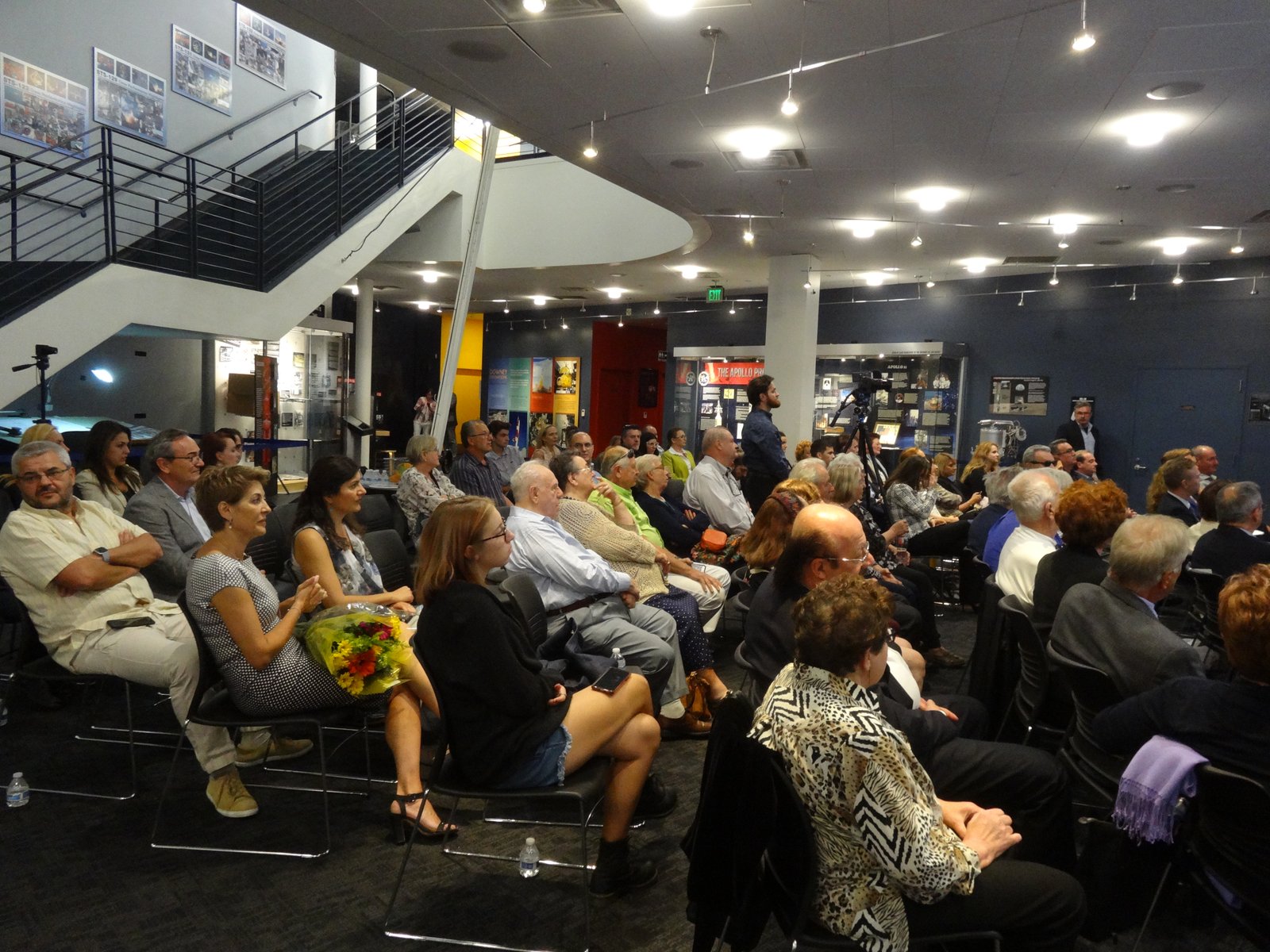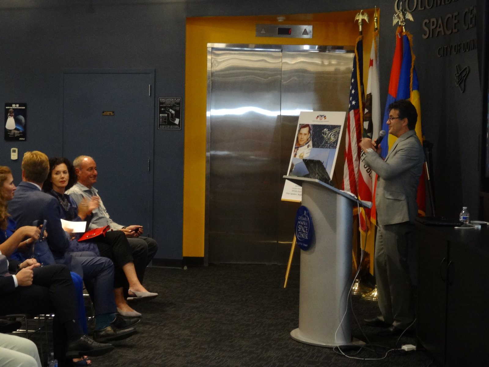 Among the beautiful artefacts and pictures related to space exploration belonging to the Columbia Center, the VRS society displayed three special graphical works by Jerry W.McDaniel, an artist with a wonderful reputation: one of the posters presented (“The Dawn of the Day” whose original painting is in the permanent US Air Force Art Collection) had been on the background TV screens broadcasting the Moon Landing of the Apollo 11 mission in 1969. Jerry W. McDaniel also designed the special poster for our special evening event. McDaniel attended the event together with Dr. Ileana Costea, California State University, Northridge professor, Director of I.C. ART Gallery that promotes the artist’s work. Two large prints of the event poster were issued and signed by both Dr. Prunariu and McDaniel; one was offered by the artist as a gift to the cosmonaut, while the other was given by VRS to the Columbia Memorial Center.