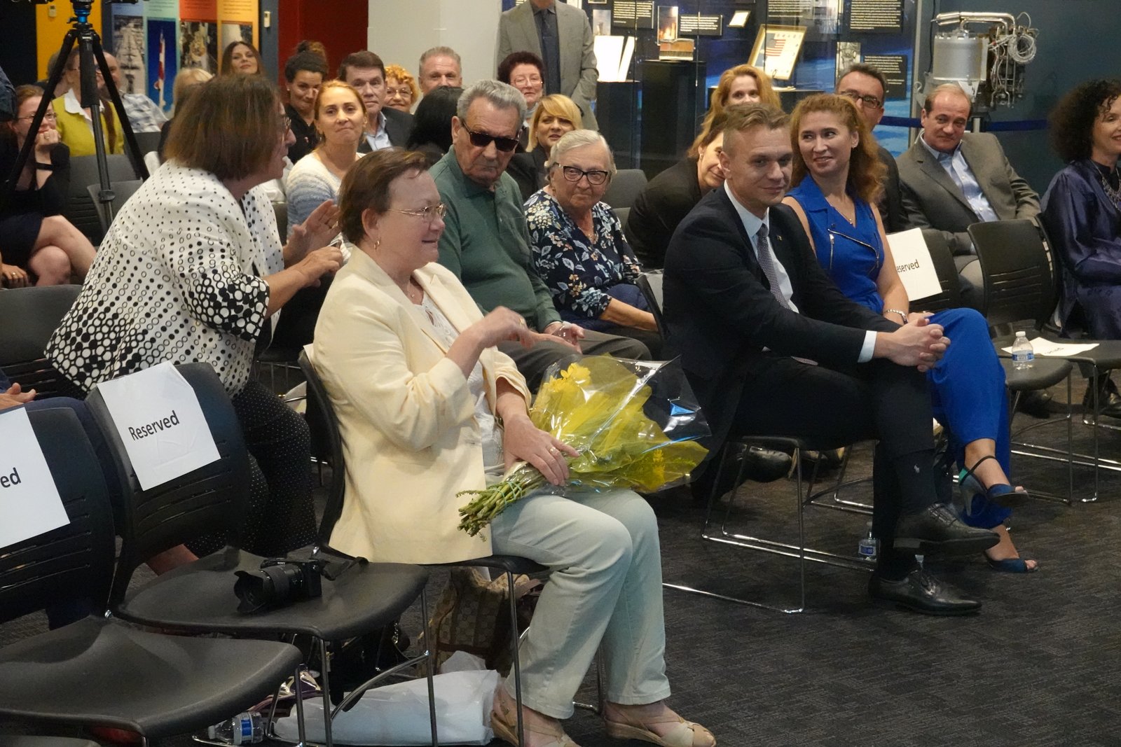 The event was opened by the President of the VRS society, Adrian Barbu. In front of an excited audience Adrian introduced our guests, and invited The Romanian Consul General, Mr. Cosmin Dumitrescu to speak on behalf of the Romanian government. In an inspired short speech Mr. Dumitrescu thanked the Romanian scientists for their contribution to the world progress and remarked how Romanian scientific talent can be found in many advanced countries, US in particular. Following the Romanian Consul General speech, Ben Dickow, the President and Executive Director of the Columbia Memorial Center addressed the audience with a short presentation of the Center’s history, also thanking the VRS community for choosing the Center for the special event of the evening.