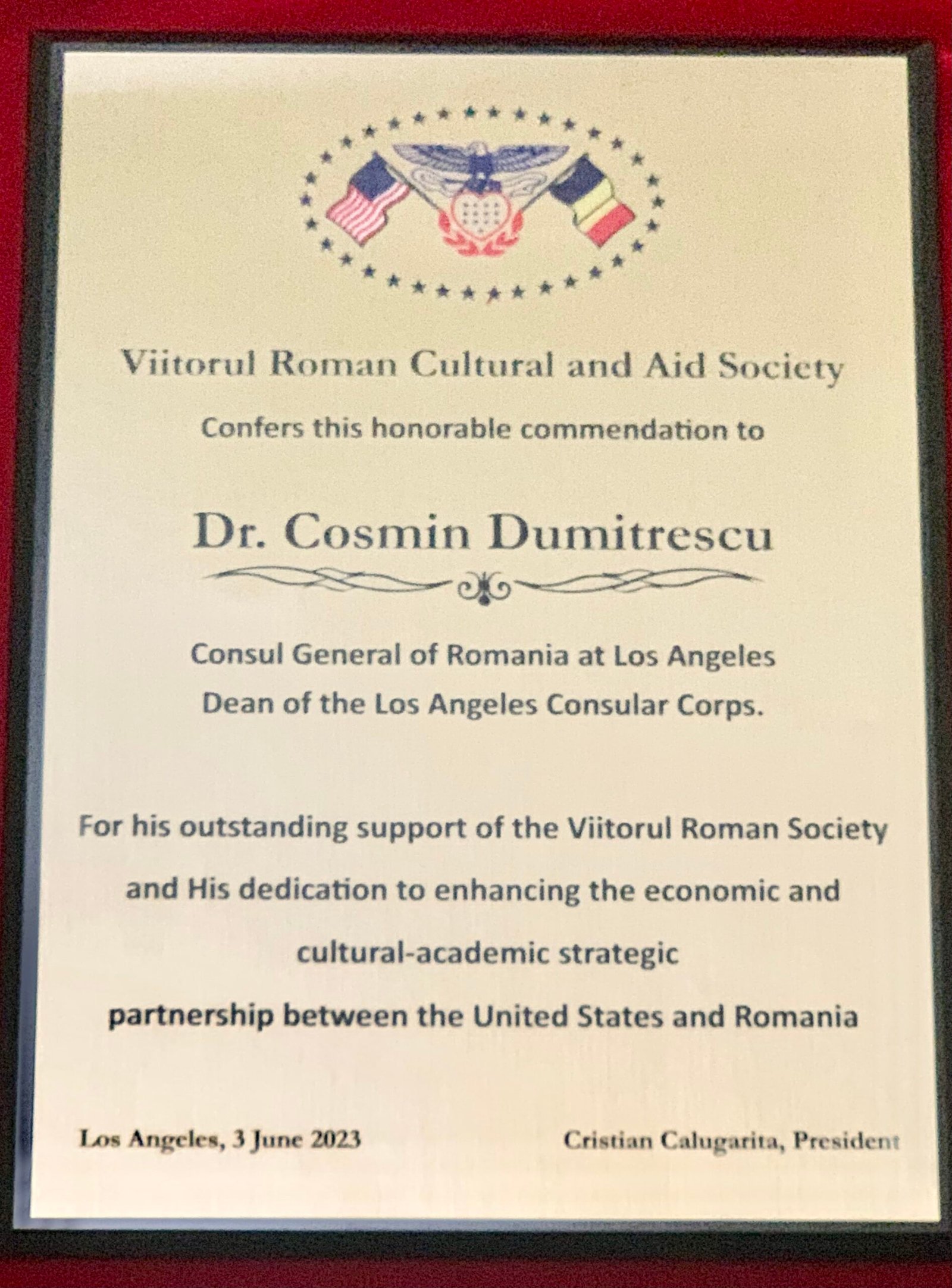 Societatea Viitorul Român a fost un partener activ și co-sponsor al unei serate remarcabile organizata Sâmbătă, 3 iunie 2023, care a avut loc în Beverly Hills și a purtat titlul semnificativ “România, Te Iubesc!”, titlu care spune totul despre natura si scopul sarbatori. Organizat cu pasiune și devotament de Aura Imbarus impreuna cu Aneta Mihailescu, evenimentul a adunat artiști români sau cu rădăcini românești, alcătuind o seară deosebită și memorabilă.